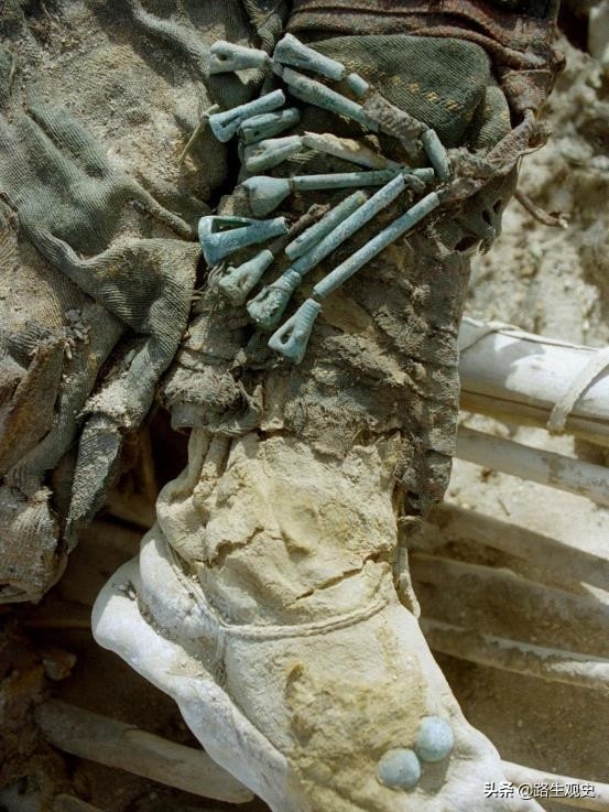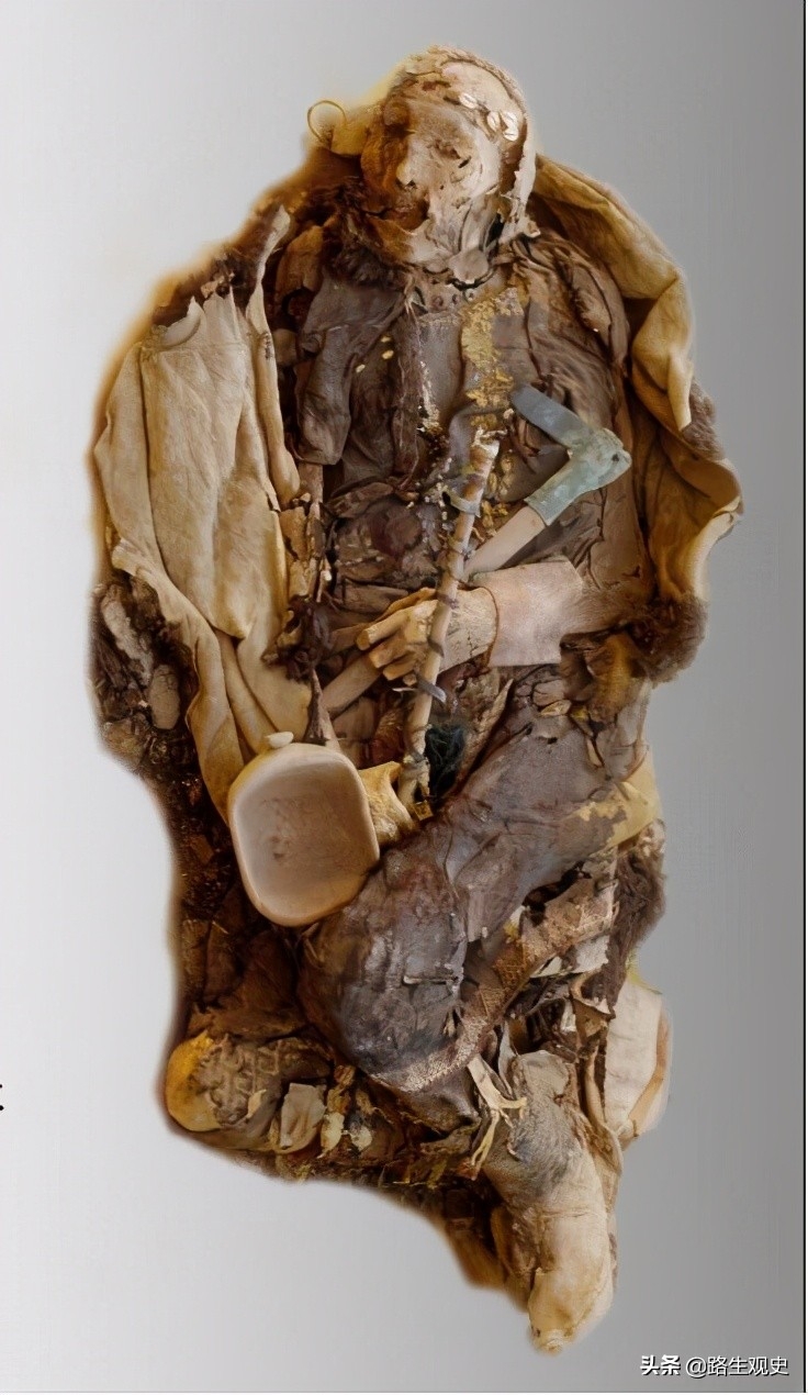 为什么要这么说呢?这是因为,自从黄金与美玉相遇的那一刻,两者之间的融合之美从来就没有被中断过,伴随它的是能够给予人们生命营养的粮食以及为生命提供保护的物产。在洋海墓地,当年的人们贴身的衣物都是绒做的,可与现代的羊绒衫相媲美,中间是毛衣,外面是皮衣。考古学家根据一些干尸的穿着及形象,推测出了他们的长相: