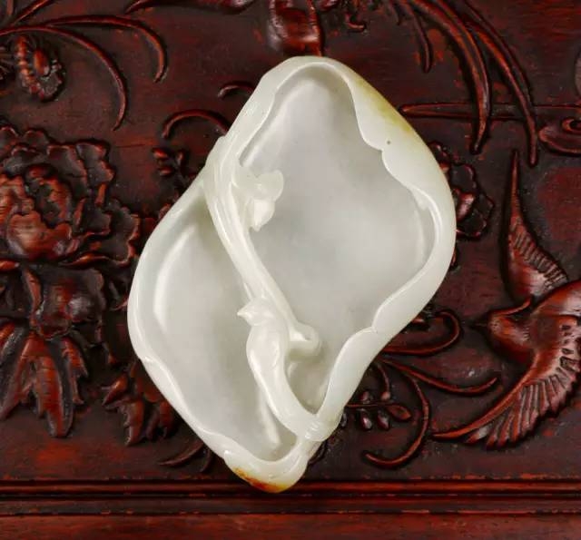 作品造型极为纤巧,状如一片花瓣,加上玉料素净、细腻的质地,整体给人秀雅、高洁之感,作者妙用减法,留大面积光素面,只在尾部雕有微小的纹饰。如此处理,让作品如洗净铅华的佳人,更显高雅。