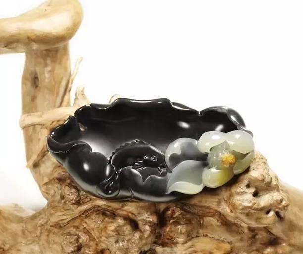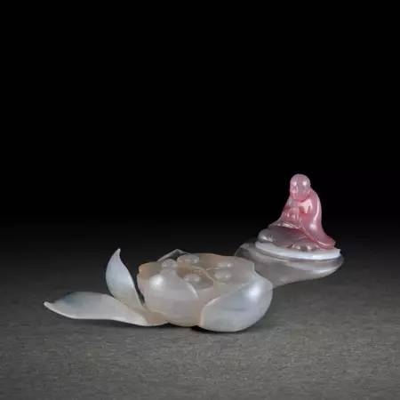 作者将冰红分明的玛瑙,俏色运用,雕琢青蛙动感逼真,趴于莲瓣之上。莲蓬上打有小孔,作香插之用,配上四片莲瓣置于其旁,奢华而不奢侈,是一件集小巧、创意、情趣的香道精品。