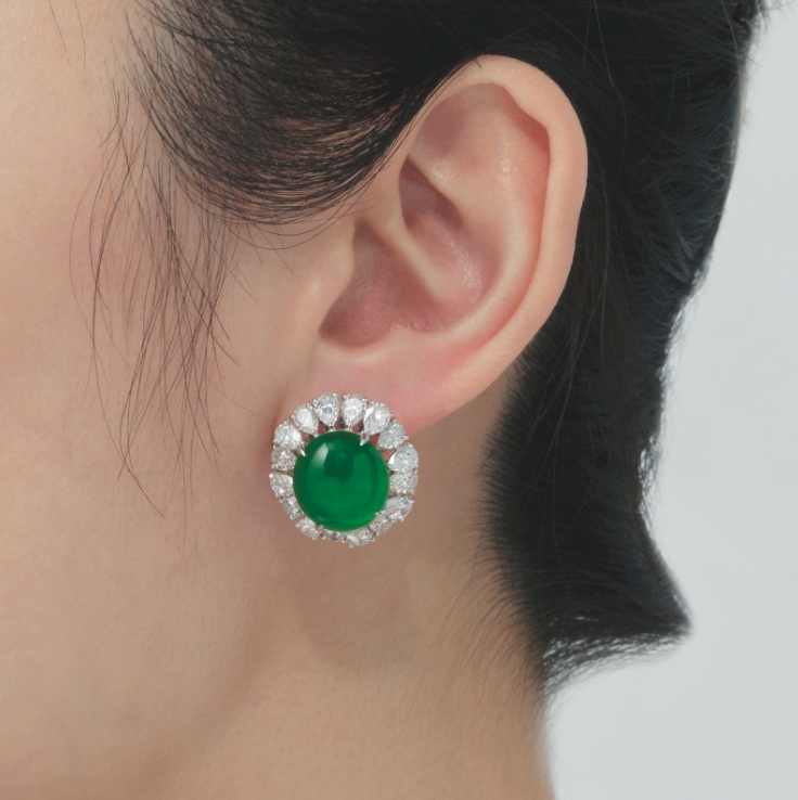 上图另外一对钻石豪华镶嵌的翡翠蛋面耳钉,猛一看和上面这对差不多,但仔细看可以发现颜色比上面那对淡了一些,尺寸也小了一点,这看似一点点并不大的差距,就让价格缩水了一半。在佳士得拍卖行的成交记录里,这对耳钉的成交价格只有400万(只有?)。