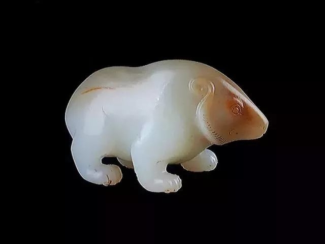 上图为咸阳博物馆西汉和田羊脂白玉圆雕玉熊,为重圈眼,眼框为两条双阴线圆圈构成,眼圈外侧用短阴线刻画出眉毛,眼珠上用圆圈刻出瞳孔,虽然眼睛小但却十分有神。