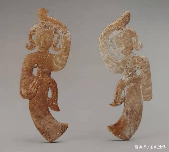 战国时期也有玉舞人的造型,但是与汉代玉舞人相比,两者都呈片状平雕,既有单舞人也有双舞人,均有穿孔,可以推测主要都是作为佩戴在身上的装饰品,而且两者的舞姿也有很多的类似,基本上是长袖舞。