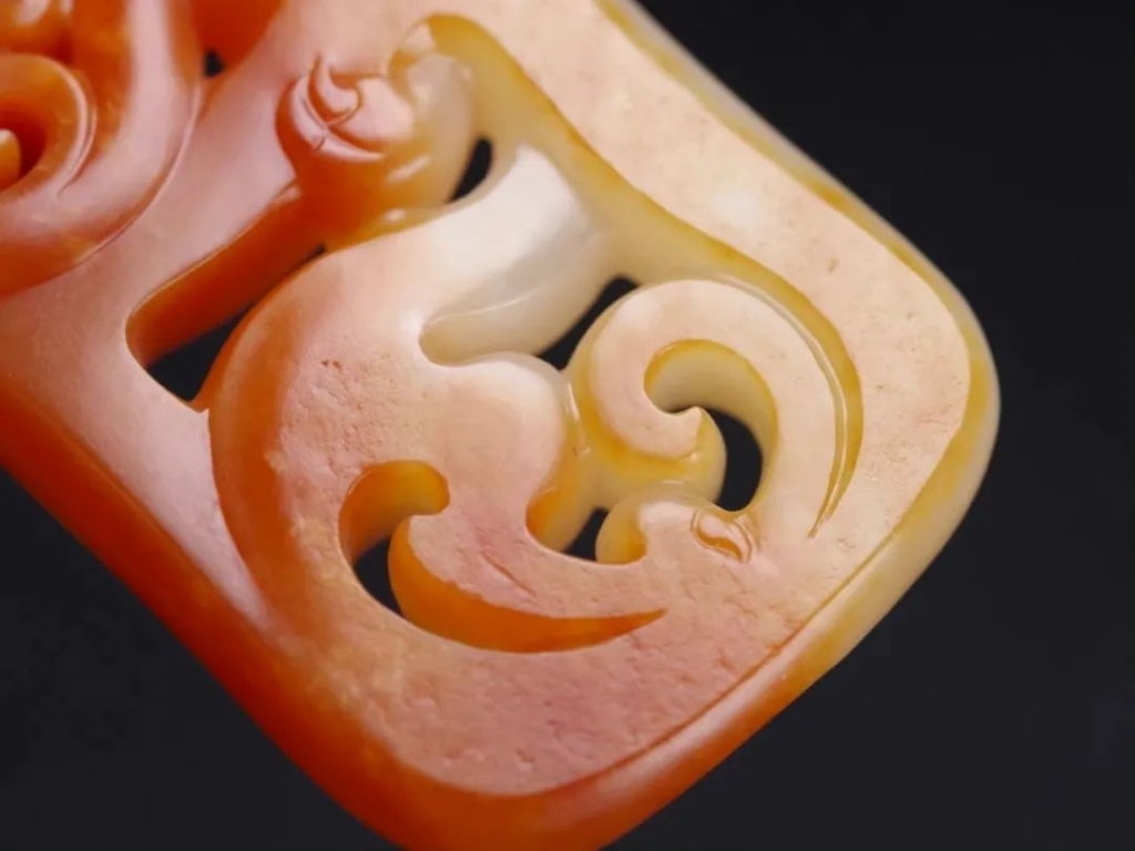 人工染色则多呈现为同一颜料的浓淡深浅变化,而没有色相差别。同时天然皮色多数聚散自如,有时集中于某一突出部,可边缘会有呈渐变状零星斑点状的浅色玉皮围绕,例如秋梨皮就是此中代表。而有些皮色则纷乱地散落在子玉体表,例如洒金皮。
