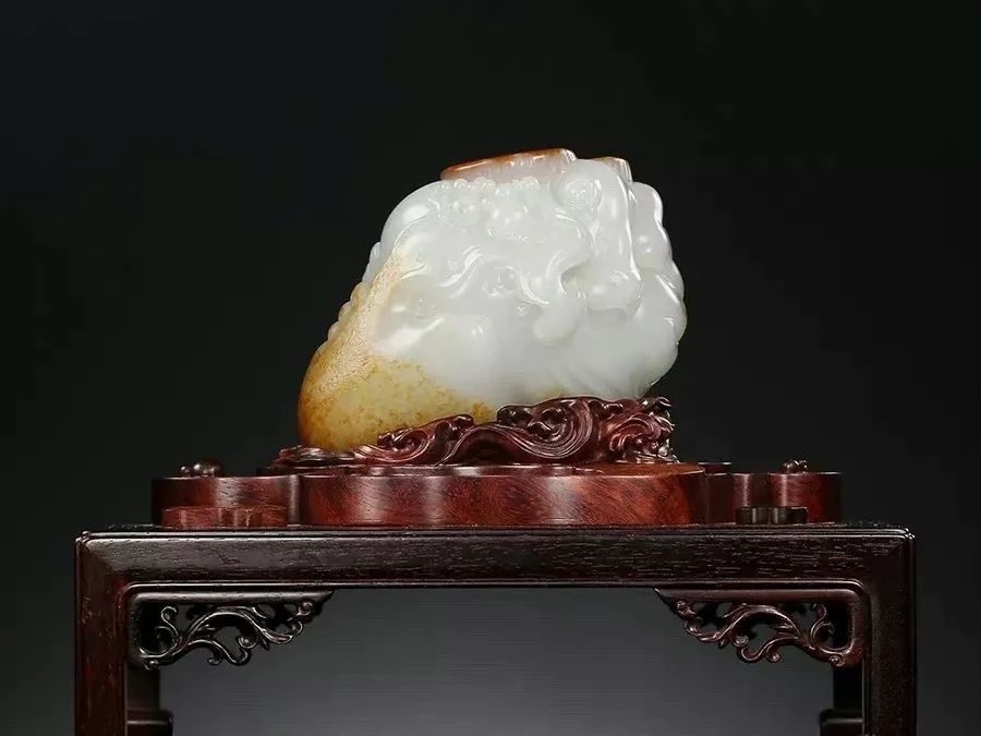 接下来就要离近些,打量玉石的皮色。真正的天然皮色多集中于子玉质地较为松懈的局部,有些下方还会带有一层薄薄的浆石。极罕见的少数子玉因为玉质结构过于细腻紧致而无法侵入皮色,也就是我们所说的粘糕料光白子,表面上与上述理论对立,实则从根本上是符合这一规律的。