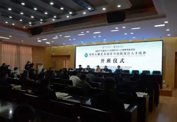 11月27日国家艺术基金项目“南阳玉雕艺术创作与创新设计人才培养”正式开班,古城南阳,备受业界瞩目的国家艺术基金艺术人才培养资助项目“南阳玉雕创作与创新人才培养”正式开班。河南省文化厅国家艺术基金管理中心河南办公室事中监督专家组代表、国家艺术基金管理中心河南办公室副主任明巧玲,中国工艺美术学会原常务副理事长、原党委副书记、国家非物质文化遗产展示研究中心专家副主任委员马佩,中国工艺美术大师、中国宝玉石协会玉石专业委员会副主任、河南省珠宝玉石首饰行业协会常务副会长、南阳拓宝玉器有限公司总经理吴元全,河南大学美术学院院长席卫权,河南工业大学设计艺术学院院长、博士生导师王庆斌,河南工程学院艺术设计学院院长、硕士生导师陈涛,北京陶瓷艺术馆馆长聂张成,南阳市科学院工艺美术研究所所长蔡士泽,南阳师范学院院长张宝锋,南阳师范学院社科处处长王春阳,南阳师范学院珠宝玉雕学院院长徐永斌,南阳师范学院珠宝玉雕学院(前)院长、项目负责人朱晓红,以及南阳师院珠宝玉雕学院部分教师、项目组工作人员、全体研修班学员等三十余人会聚南阳师范学院,共同见证了这场玉雕界盛事。开班仪式由南阳师范学院副校长刘红林主持。