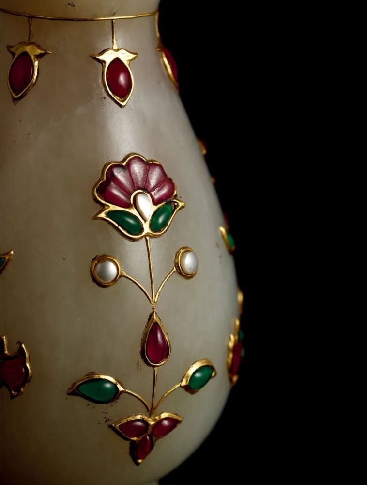 此件白玉嵌宝瓶塑面纹饰简洁匀称,造型端庄典雅,宝石熠熠生辉,雍容华贵,与中原传统人文意韵截然不同,给人以另类的美学享受。类似痕都斯坦玉器嵌百宝的花叶纹样装饰还可参见台北故宫博物院所藏一件蒙兀儿帝国带镶嵌盘。
