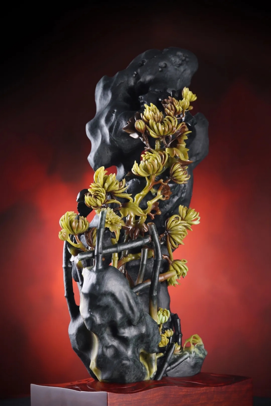 整件作品造型工整,严谨不失法度,秋菊造型轻快,亮光处理,太湖石造型概括中不失细节,劲健处不失灵动,柔光处理,瘦、皱、漏、透,大小体面嵌套流转,空间灵动,也成就出一番节奏和律动。