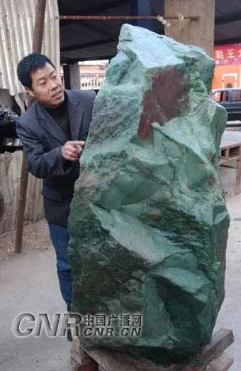 2002年,密玉矿601矿洞地下110米深玉石釆区下料前(拍照)。发现一处特级玉石主矿脉瓜蛋式玉带总长14米宽1.5米。